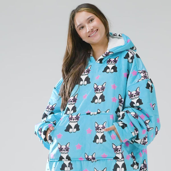 Lounge Pug Ekstra Stort Hettegenserpledd, Ekstra Stor Genser for Menn og Kvinner, Minky Mops– Big Bertha Original NO